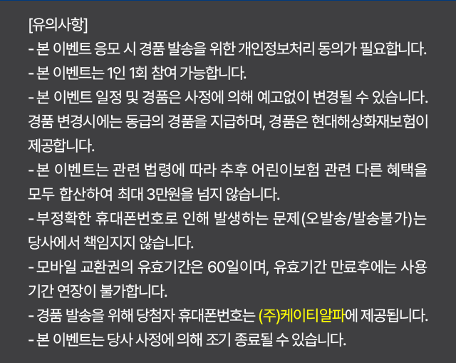 - - 본 이벤트 일정 및 경품은 사정에 의해 예고없이 변경될 수 있습니다. 경품 변경시에는 동급의 경품을 지급하며, 경품은 현대해상화재보험이 제공합니다.